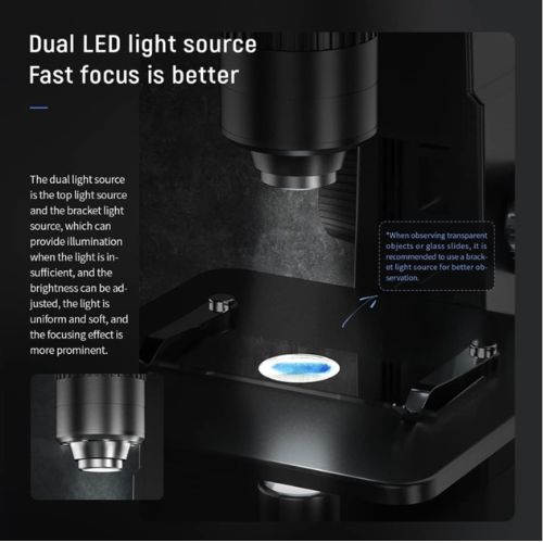 - 10 đèn LED sáng và 1 đèn LED siêu sáng , nguồn sáng phía trên quan sát vật thật, nguồn sáng phía dưới quan sát mẫu vật, cho hình ảnh ba chiều rõ nét hơn.