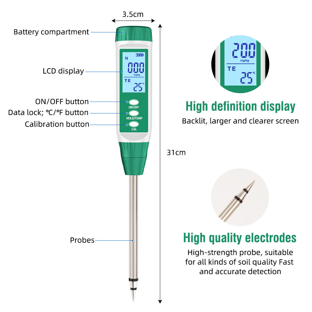 - 🧭 Hướng dẫn sử dụng: Trước khi đo, nên làm ẩm đất vừa đủ, loại bỏ đá/khoáng vụn lớn, chèn đầu dò thẳng đứng hoặc theo hướng chỉ dẫn, đợi ổn định rồi đọc kết quả.