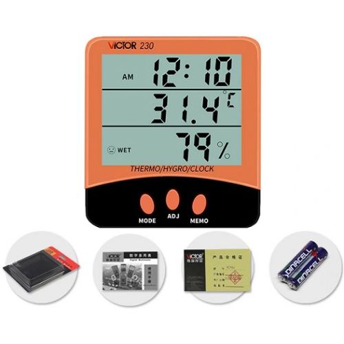 - Nhiệt ẩm kế Victor VC230 đồng hồ đo nhiệt độ độ ẩm được sử dụng để giám sát nhiệt độ, độ ẩm trong nhà, đồng hồ có màn hình hiển thị to, rõ nét với chất lượng linh kiện và gia công tốt từ chính hãng Victor, đồng hồ còn có thêm các tính năng: hiển thị giờ, báo thức, hiển thị trạng thái môi trường...
